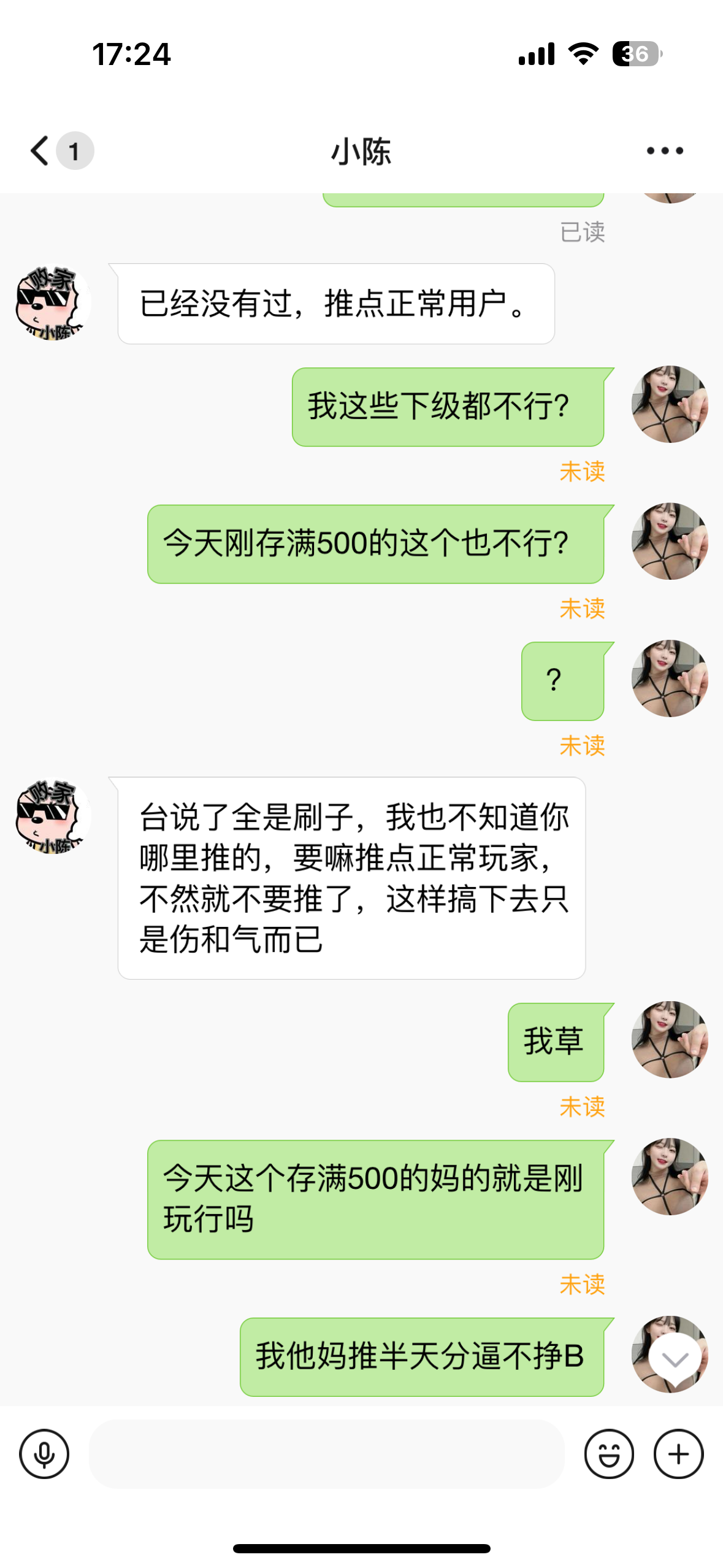 麻痹给他推半天一开始说一个充100给我30又说让我让他们冲到500才给我一个100到了也不给又说是刷子当时他们存100的时候不说不让我让他们存了存好了麻痹说是刷子跟傻逼一样两天几个人后台做了2万流水业绩最少在流水盘也有几百真傻逼