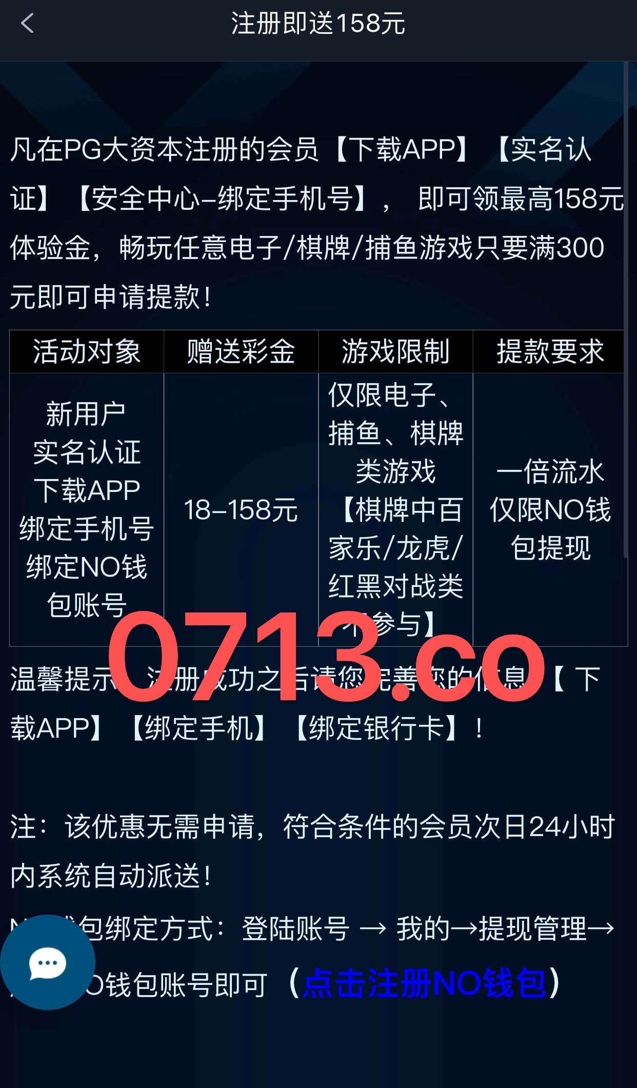新用户下载app注册绑定手机号绑定NO钱包 次日24小时内自动赠送18~158彩金 新出来的平台基本都送 限制游玩电子捕鱼棋牌 最低提款300元