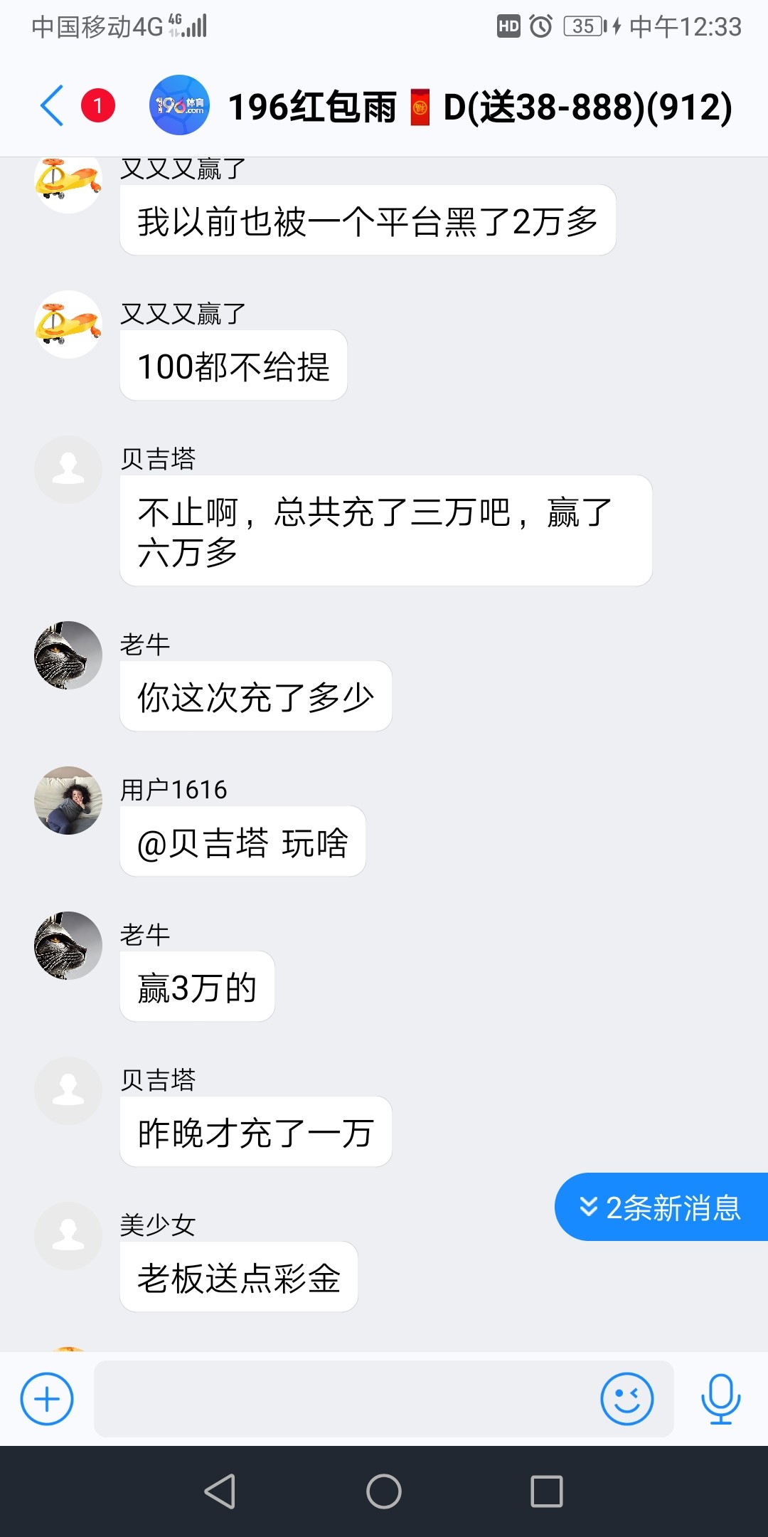 老哥充值10000提款30000直接被黑。不过总体也是赢了60000!发送被黑证据直接被清理出去群,封号!非担保台子和野鸡台千万不要大额玩
