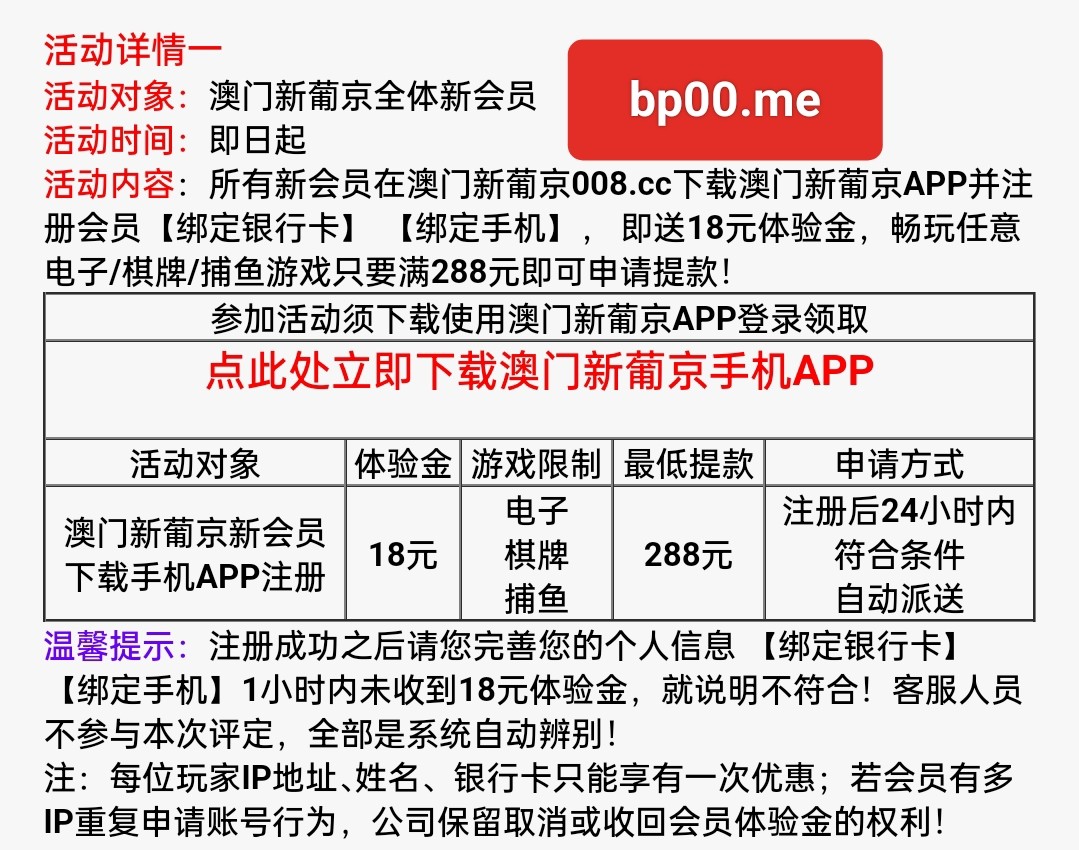 下载APP注册成功之后请您完善您的个人信息 【绑定银行卡】 【绑定手机】1小时内未收到18元体验金,就说明不符合!