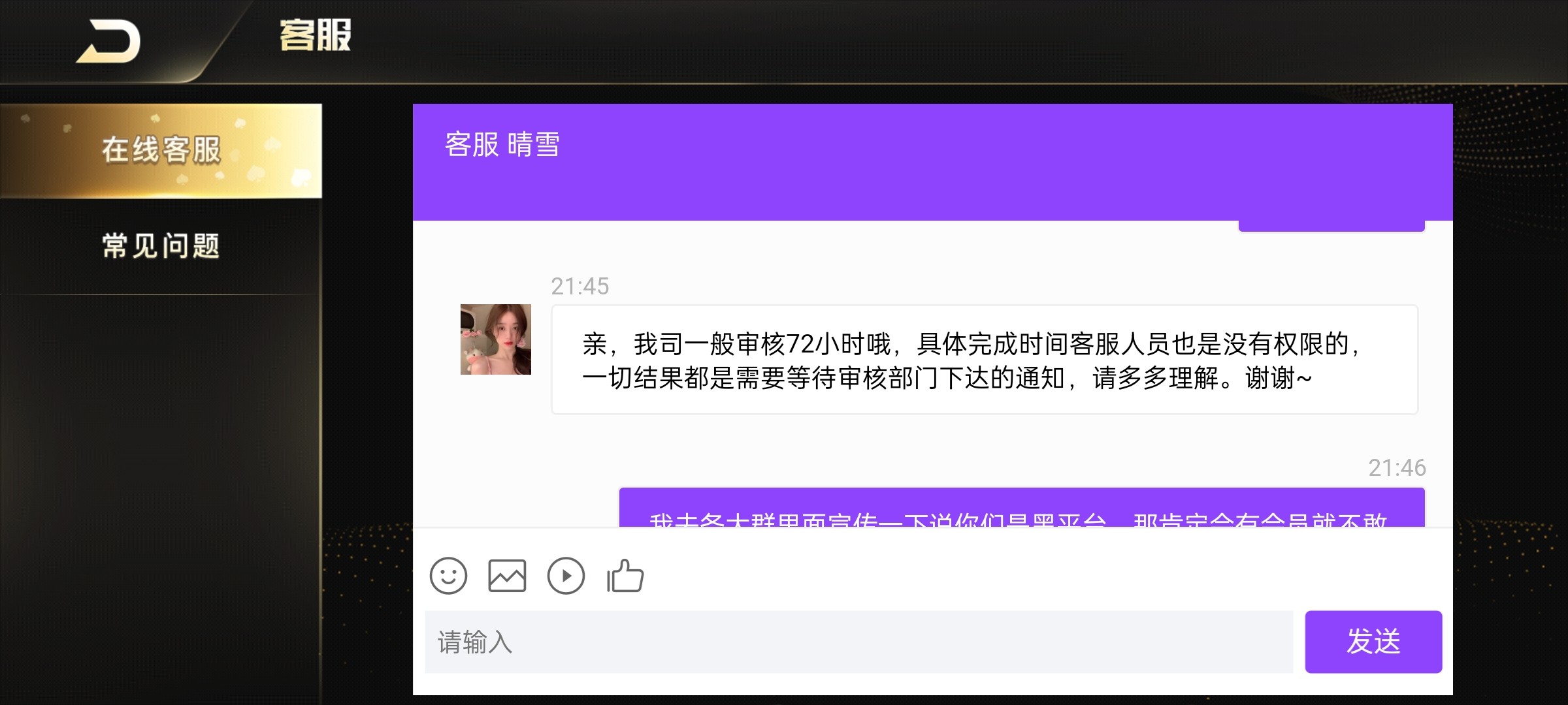 充了100提了426黑了,说什么注单审核,一般这种模板说注单审核就是黑了,大家避雷,别玩了,别充了,平台没有信誉,做不长久!
