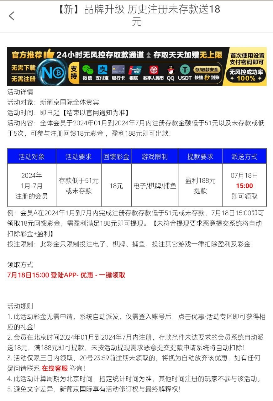 7月之前注册历史没有存款最低18,盈利188出款。