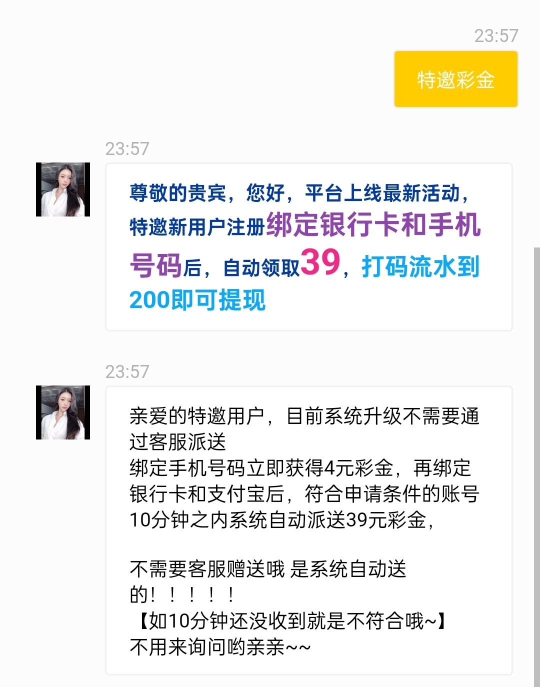 绑定手机号码立即获得4元彩金,再绑定银行卡和支付宝后,符合申请条件的账号10分钟之内系统自动派送39元彩金