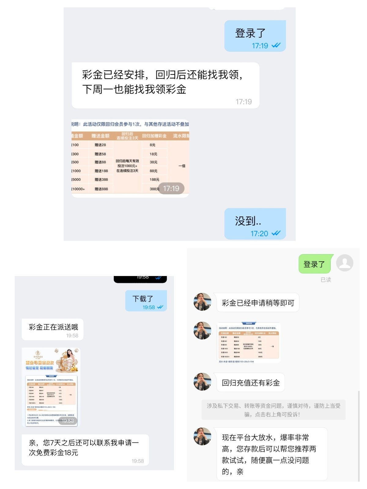 老用户(要有充值过的)  直接登录账号,联系在线客服跟它说领取电话彩金,客服会让你添加专属客服,不查电话的  应该是人人都有  就充了100历史  送了几个彩金了  出款自测,不要充值