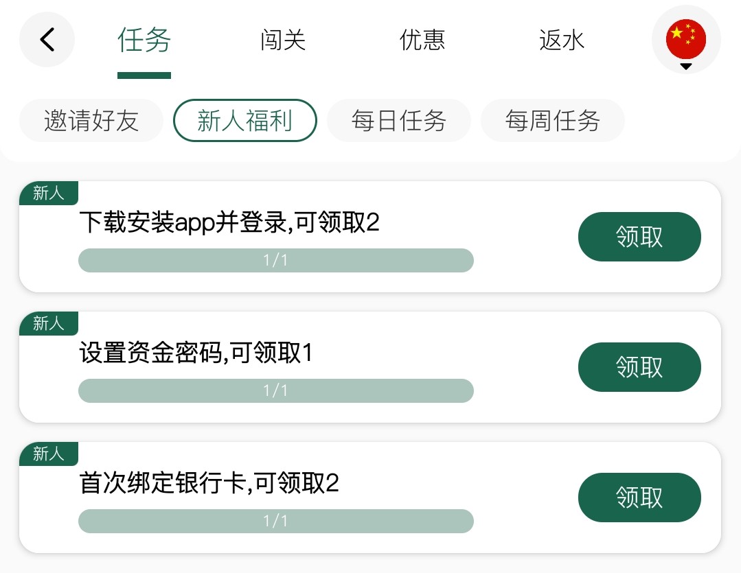 注册绑定手机号/下载APP/绑定银行卡交易密码/优惠在右下角第二个/点进去之后在任务新人福利那里就可以看到了/一倍流水/没有游戏限制/其余自行查看自测!