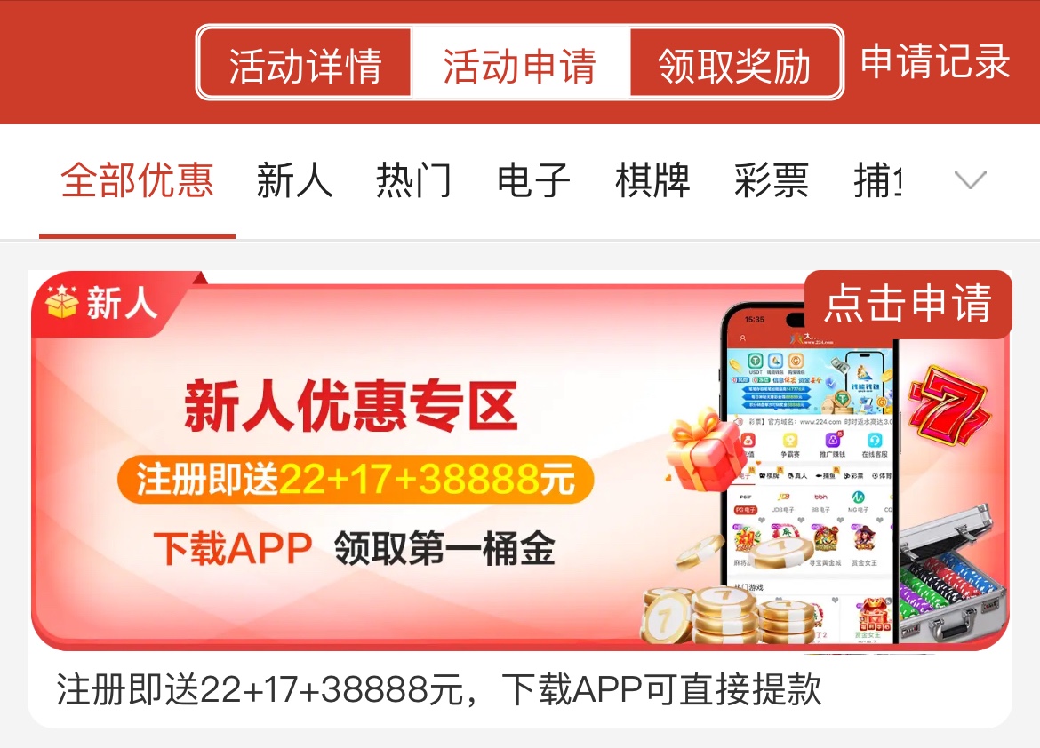 注册完善资料活动申请22限一分彩/三分彩/五分彩/电子/棋牌(百家乐/龙虎斗除外)盈利满224才能取款,下载APP送17可以直接取款,注册满一周送8限PG电子,满100提现,总共送47彩金
