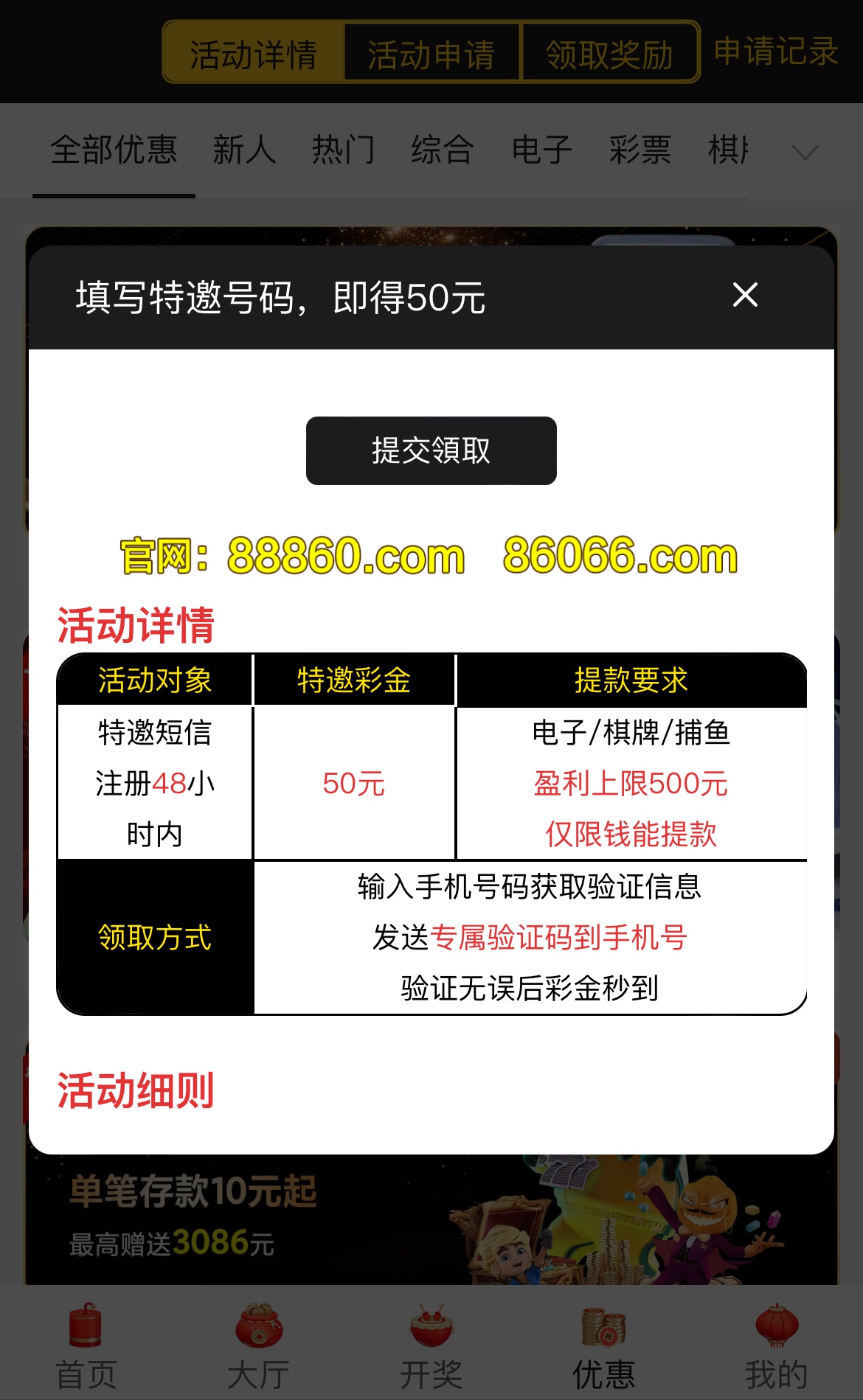 特邀送50,注册过的重新注册,彩金10倍流水,只能提500,最低提款500