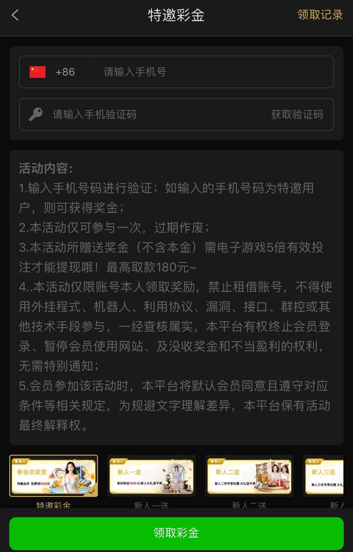 特邀碰瓷,注册优惠里自助申请,彩金5倍流水,限电子,最高提现180