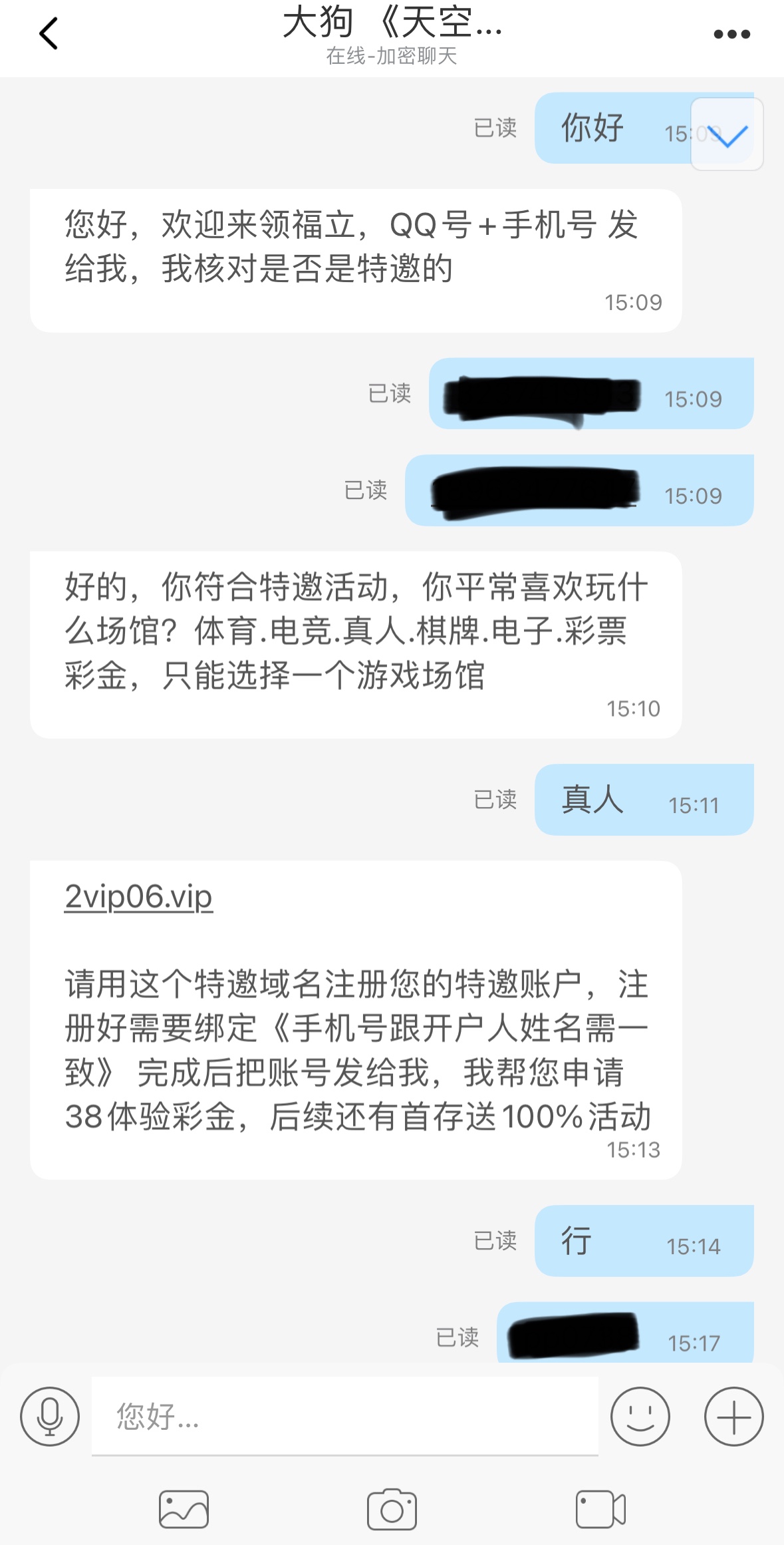 同意后他会给你发聊天软件,下载联系上面客服领取,5倍流水,最低100提现,体育.电竞.真人.棋牌.电子.彩票彩金,只能选择一个游戏场馆