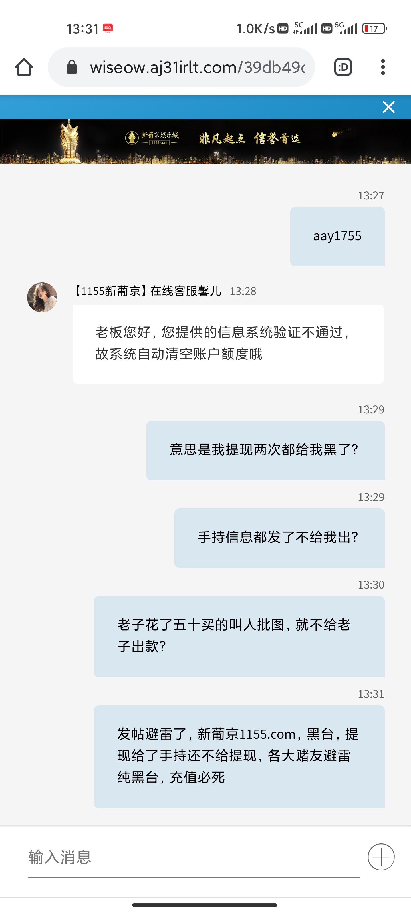 威尼斯1155.com,黑台,提现一天不到账,叫我提供手持身份证银行卡,我给了之后直接说信息不通过,余额清零,垃圾黑台,避雷200块都黑,充值必死