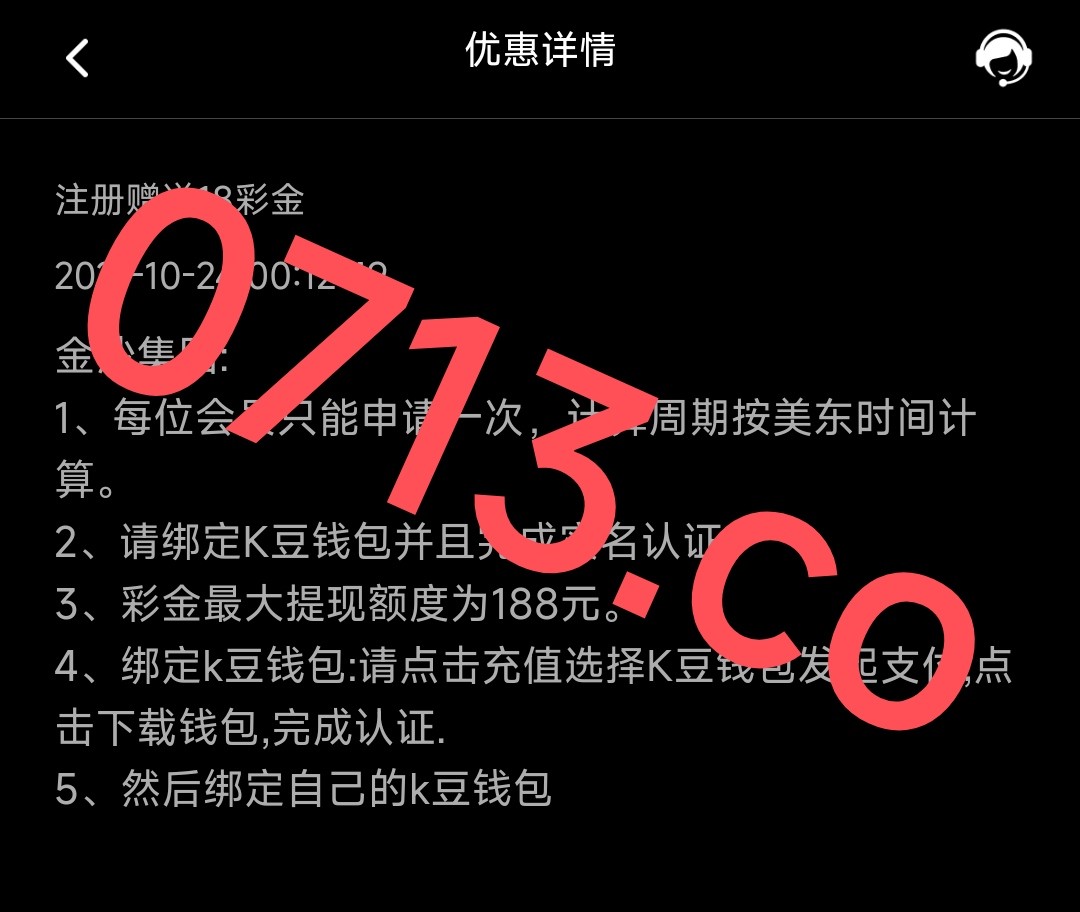 新用户注册绑卡绑定kdpay钱包地址 没有这个钱包的下载注册一个 然后联系在线客服申请18元彩金 不查任何 亲测领到了 无游戏限制 最低提款100元 最高提款188元