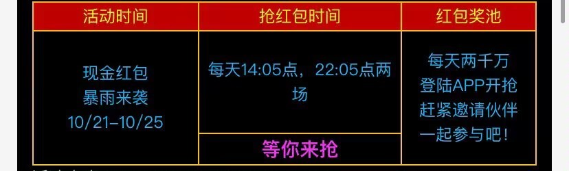 红包雨是 天庭 95 K1 21号-25号每天下午2点05分-晚上10点05分 分别是两场红包雨(要下载APP抢)