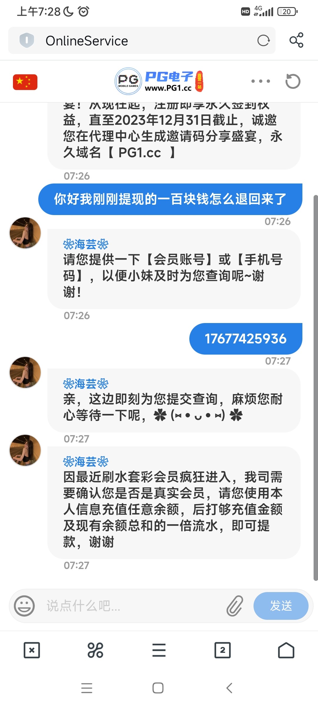 刚开始白嫖到一百,不给提现说要任意充值才能提现,现在充值了50打到400,提现又说要充值1000才能提现。大家避坑吧www.PG1.cc