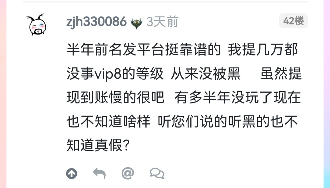 半年前名发平台挺靠谱的  我提几万都没事vip8的等级  从来没被黑      虽然提现到账慢的很吧   有多半年没玩了现在也不知道啥样  听您们说的听黑的也不知道真假?