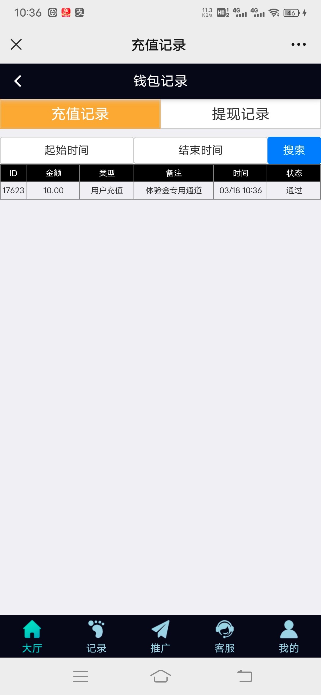 微信扫码进去点击充值 选择体验金通道 输入10元 然后点击提交等待到账