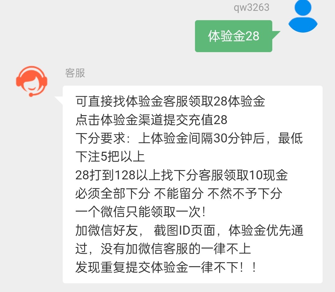 28打到128以上找下分客服领取10现金pj必须全部下分 不能留分 不然不予下分一个微信只能领取一次!加微信好友, 截图ID页面,体验金优先通过,没有加微信客服的一律不上发现重复提交体验金一律不下!!