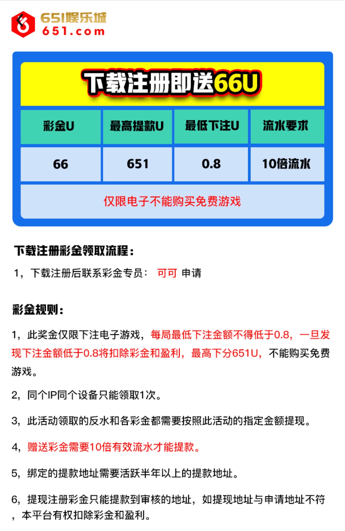 注册完善资料,联系专员可可申请,最高提款651U,最低下注0.8,10倍流水,需要绑定活跃半年以上的U地址