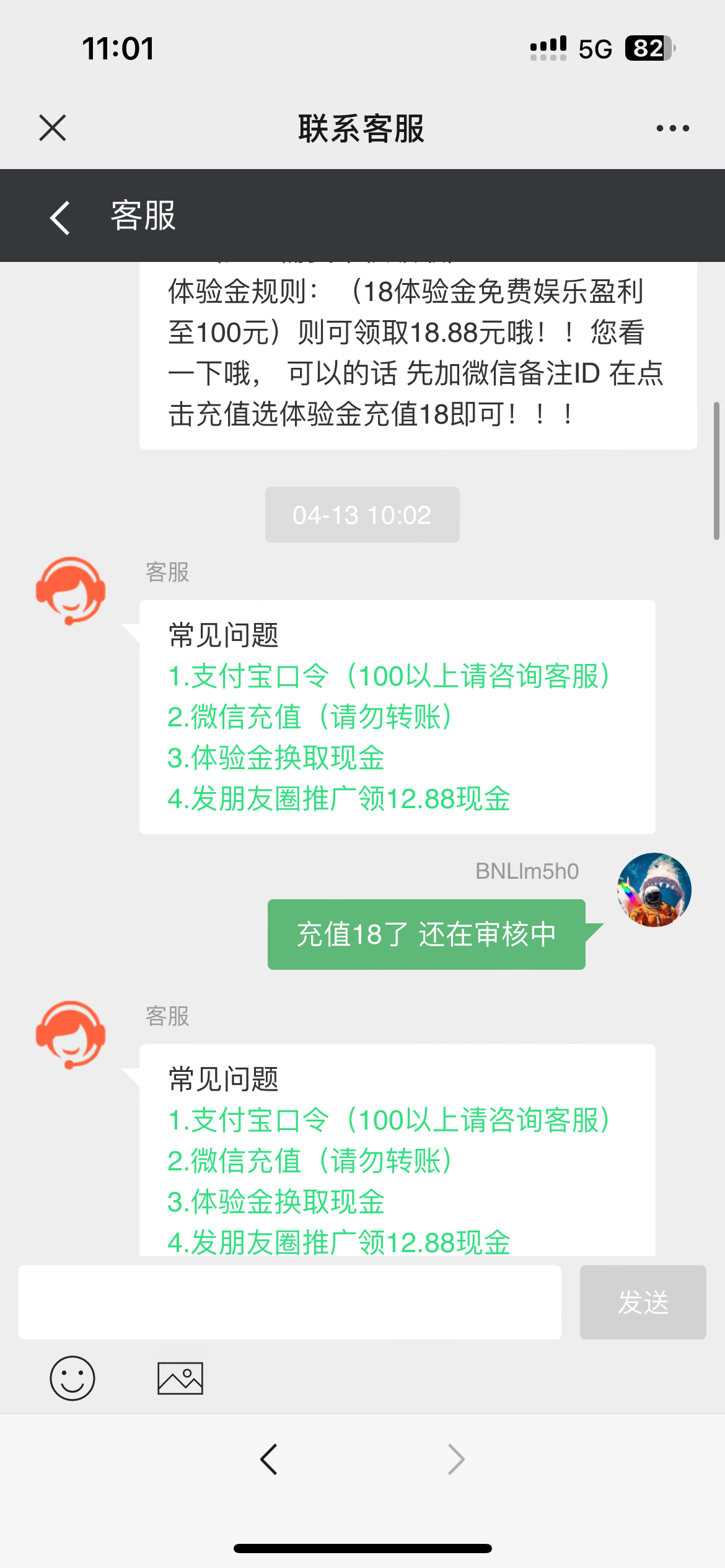 微信扫码进去点击充值 选择体验金通道 输入18元 然后点击提交等待到账